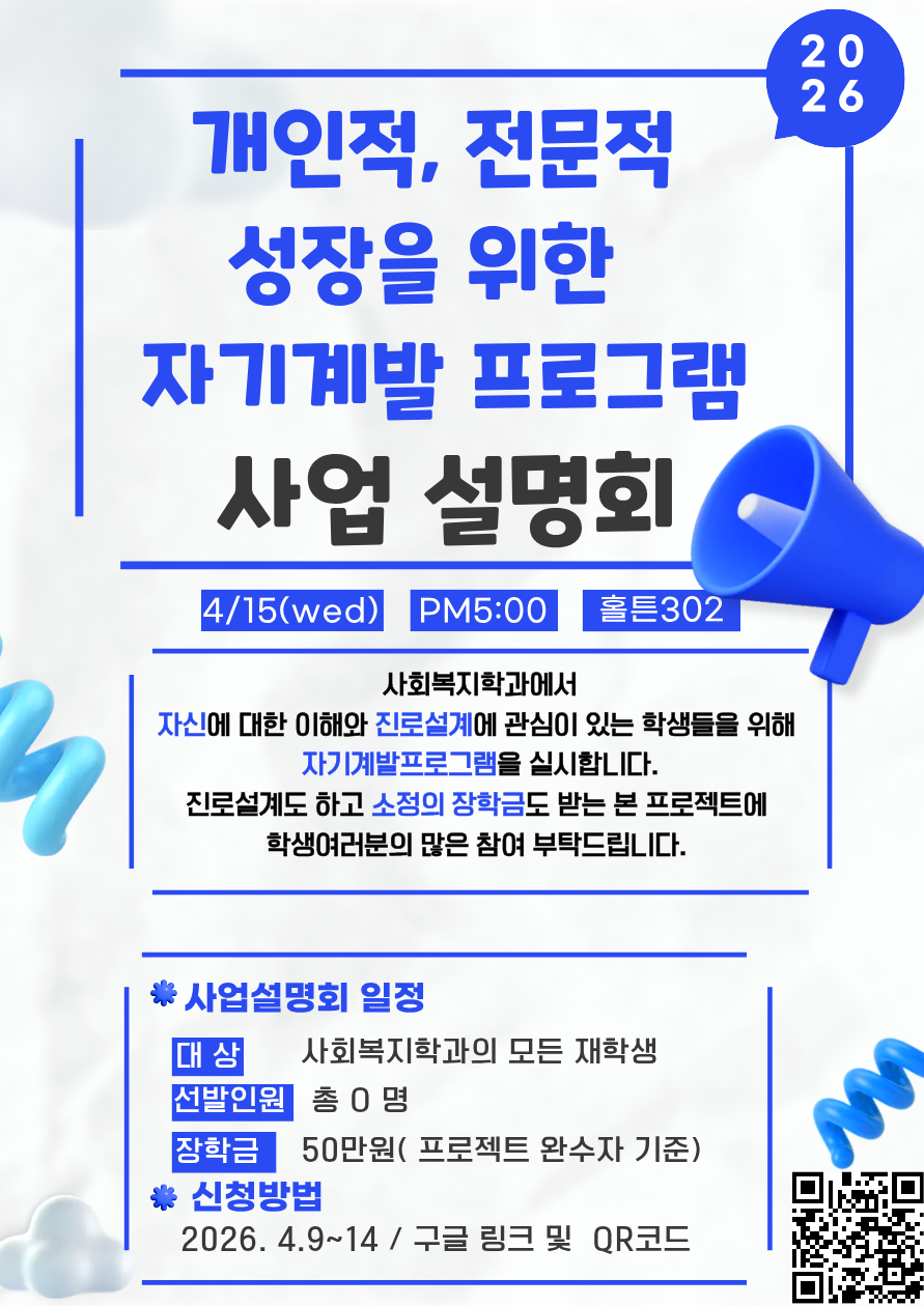 게시물 상세보기 - 제목, 등록일, 조회, 작성자, 내용으로 구성 제목 [사회복지학과] 개인적. 전문적 성장을 위한 자기계발프로그램 사업설명회신청(~4/14) 등록일 2026-04-09 조회 19 작성자 학과조교