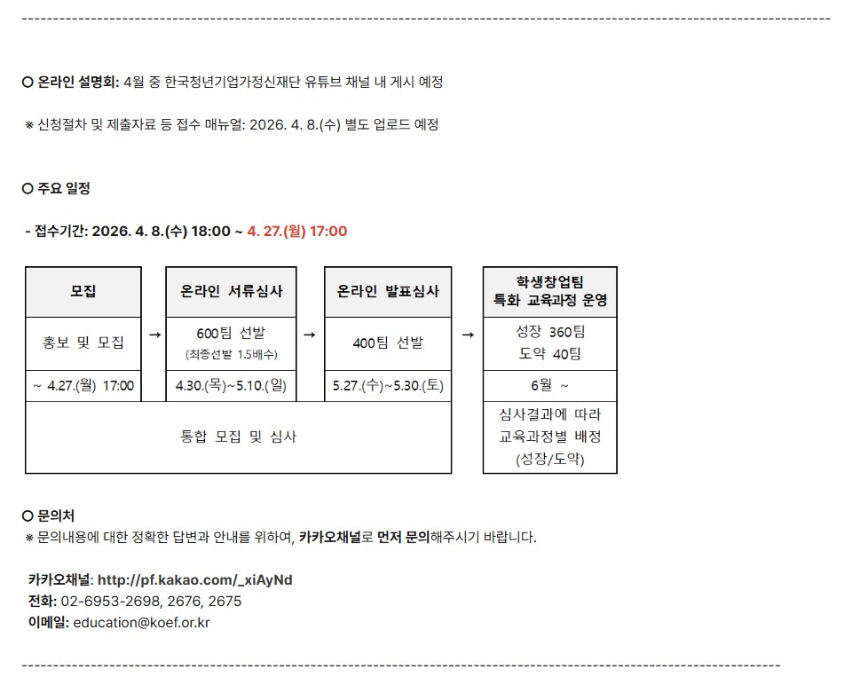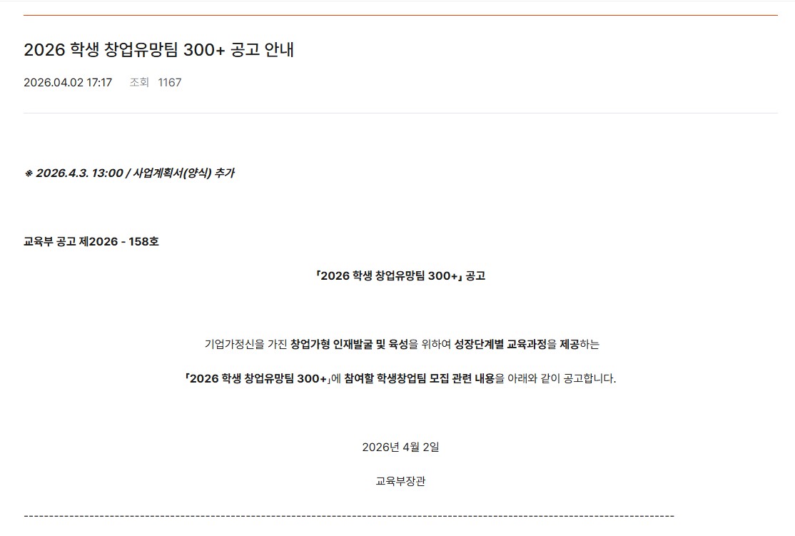 게시판 상세(일반) 게시물 상세보기 - 제목, 등록일, 조회, 작성자, 내용으로 구성 제목2026 학생창업 유망팀 300+ 등록일2026-04-03조회39 작성자취창업지원센터 참여링크및 양식: https://u300.kr/board/notice/detail/497 목록