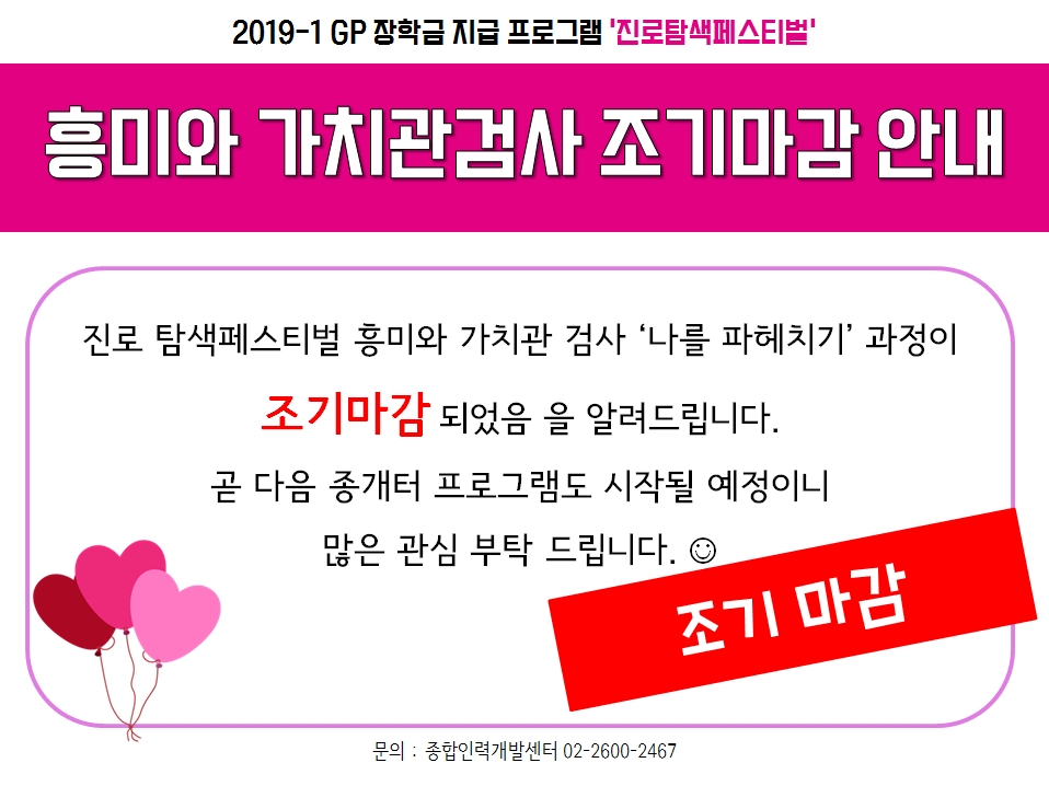 | 제목 | [종합인력개발센터] 흥미와 가치관 검사 '나를 파헤치기' 조기마감 안내 | ||