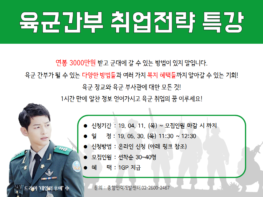 | 제목 | [종합인력개발센터] '연봉 3천 받고 군대가는 법!!' 육군간부 취업전략 특강(1GP) | ||