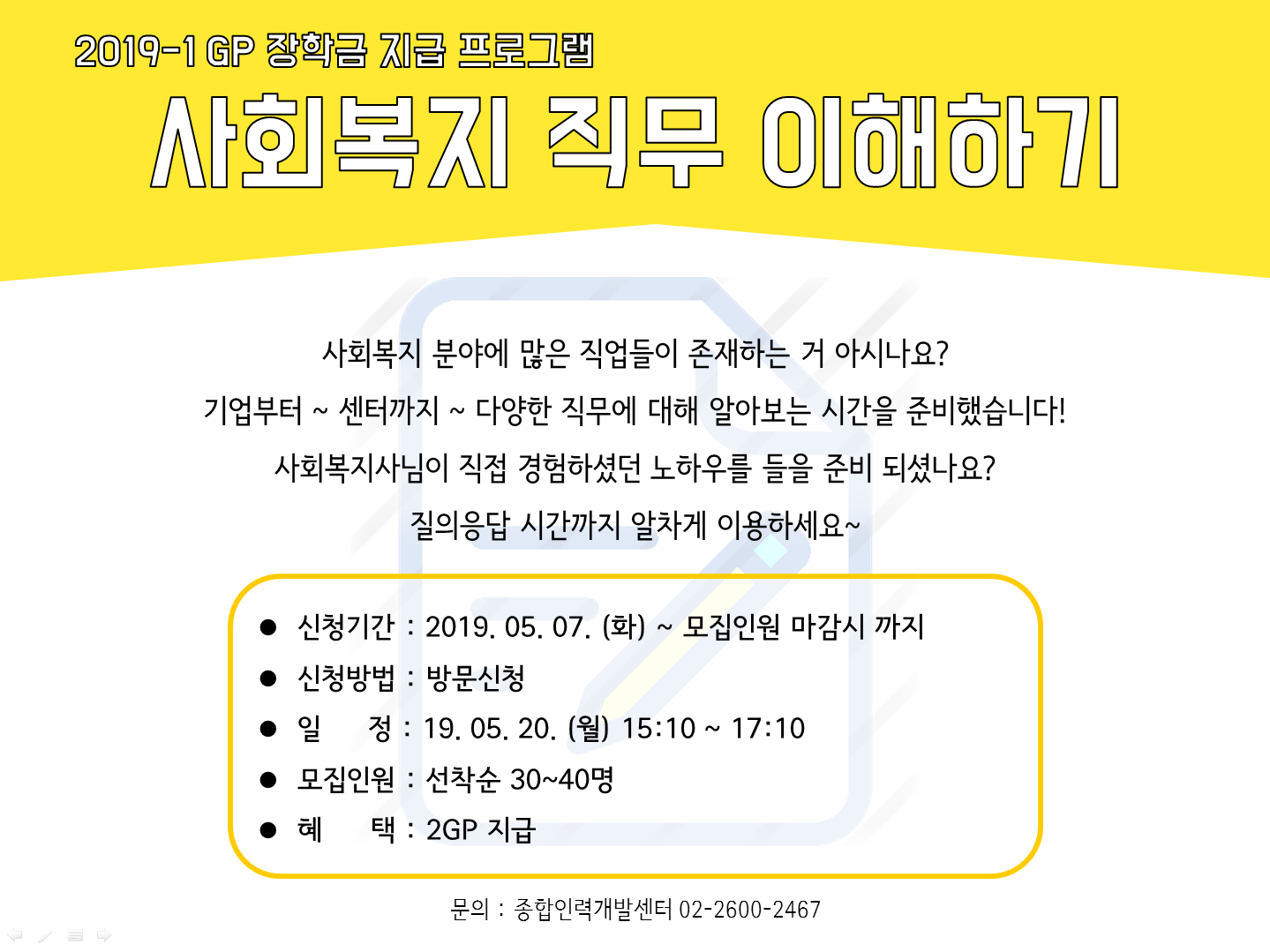 | 제목 | [종합인력개발센터] 사회복지 직무 이해하기 | ||