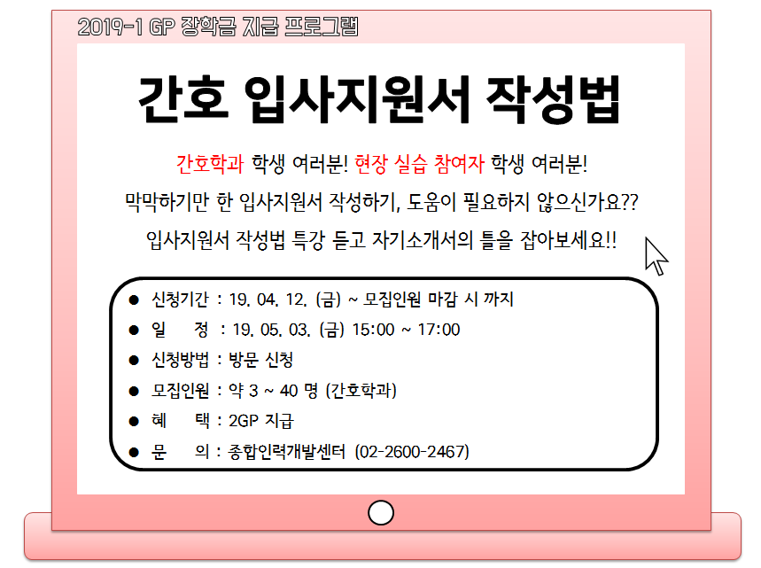 | 제목 | [종합인력개발센터] 간호 입사지원서 작성법 (2GP 지급) | ||