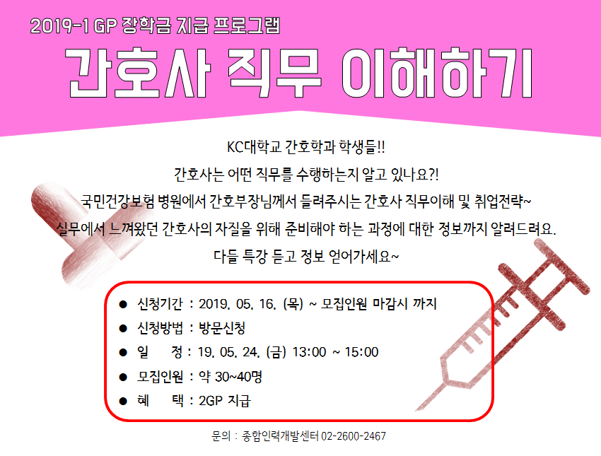 | 제목 | [종합인력개발센터] 간호사 직무 이해하기 (2GP 지급) | ||