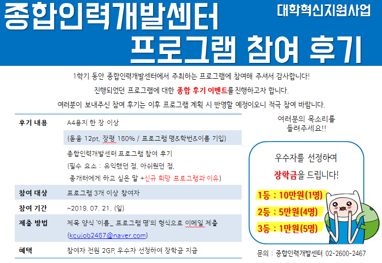 | 다음글 | [종합인력개발센터] 금융권 취업 & 자소서 특강 안내 (소감문 제출시 2GP) | 2019-09-17 |