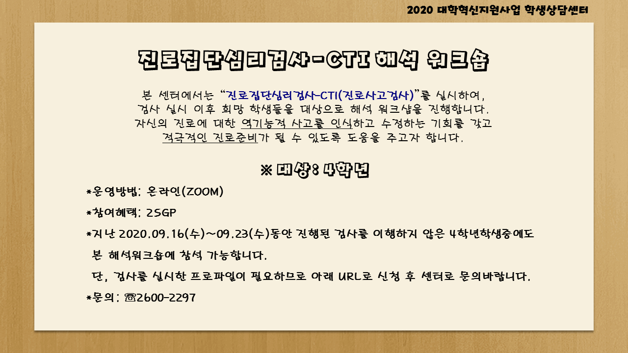 | 제목 | [혁신-학생상담센터]진로집단심리검사-CTI 해석 워크숍 | ||