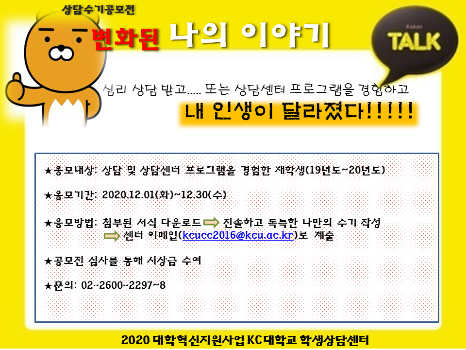 상담수기공모전변화된 나의 이야기 심리상담받고..... 또는 상담센터 프로그램을 경험하고 내 인생이 달라졌다!!!!! ★응모대상: 상담 및 상담센터 프로그램을 경험한 재학생(19년도~20년도)들 ★응모기간: 2020.12.01(화)~12.30(수) ★응모방법: 첨부된 서식 다운로드 -> 진솔하고 독특한 나만의 수기 작성->센터 이메일(kcucc2016@kcu.ac.kr)로 제출 ★공모전 심사를 통해 시상금 수여 ★문의: 02-2600-2297~8