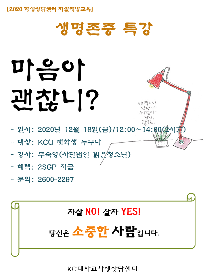 생명존중 마음아괜찮니? 특강 - 일시: 2020년 12월 18일(금)/12:00~14:00(2시간)