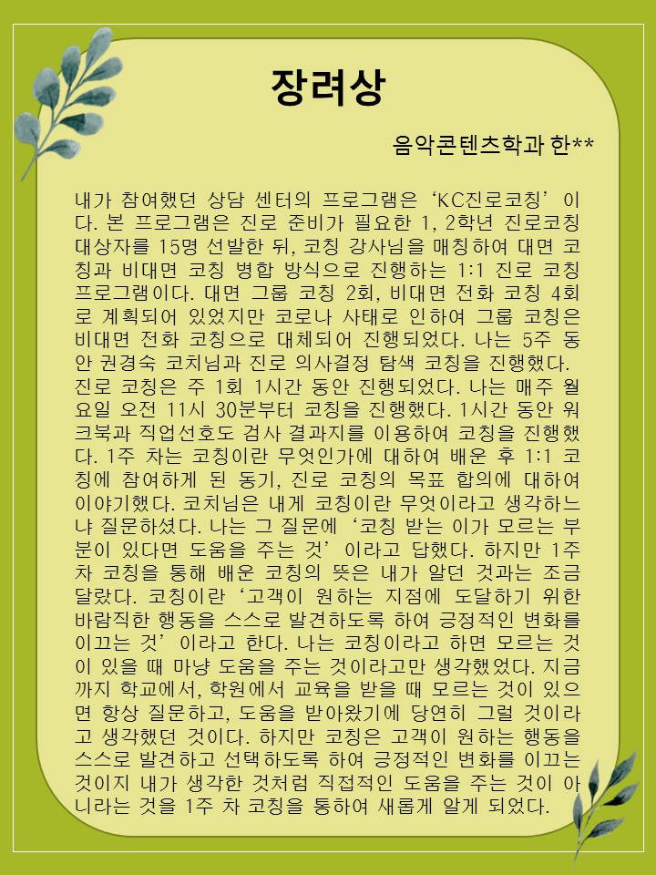 | 제목 | [혁신-학생상담센터]상담수기공모전 변화된 나의 이야기- 장려상 한** | ||