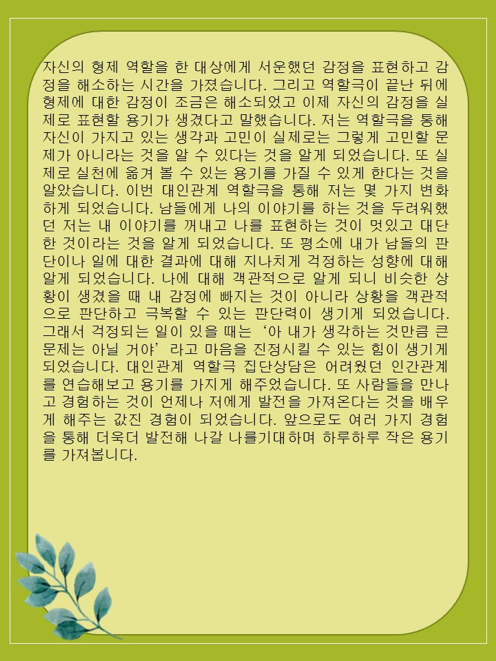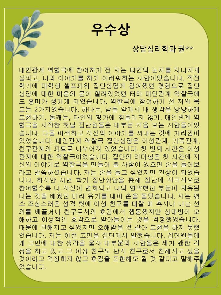 | 제목 | [혁신-학생상담센터]상담수기공모전 변화된 나의 이야기- 우수상 권** | ||