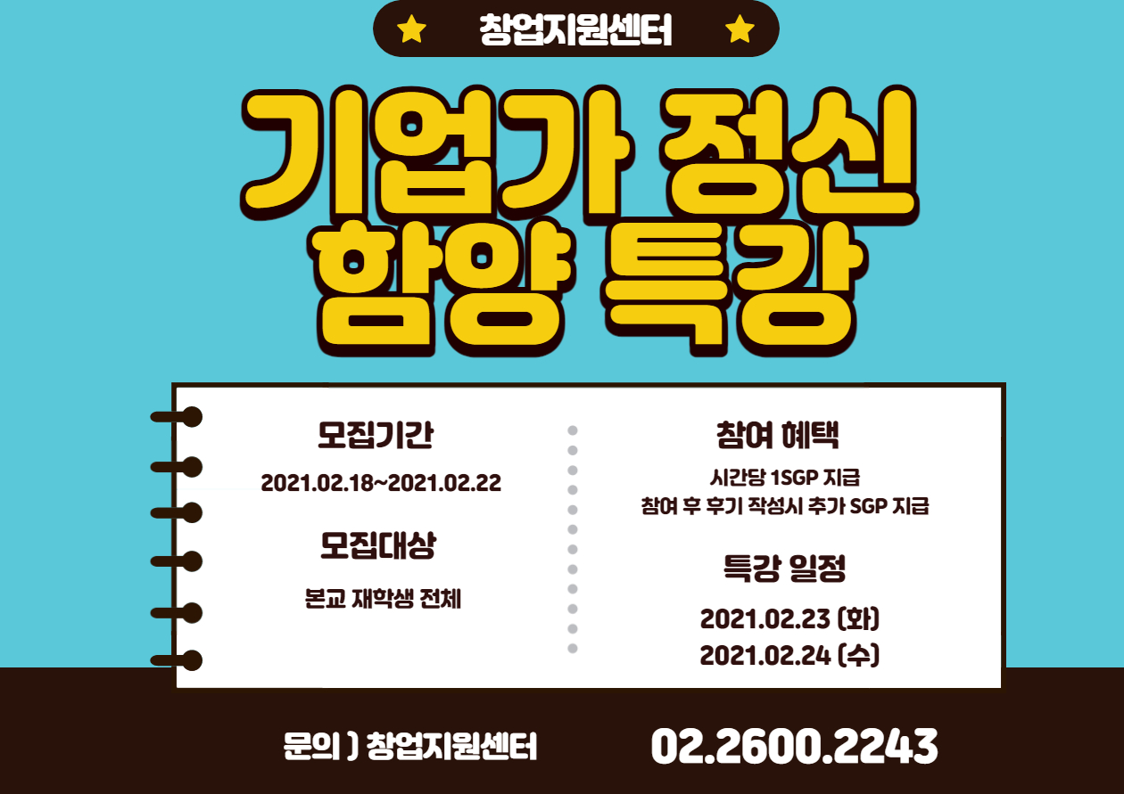 | 제목 | [창업] 기업가정신 함양 특강 참여자 모집 | ||